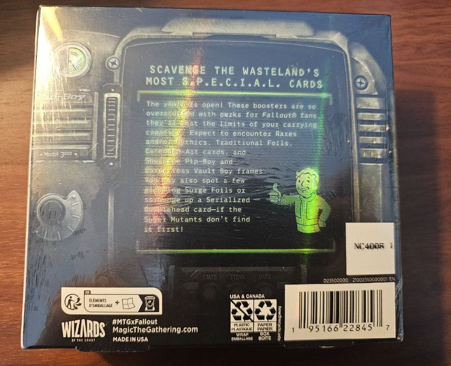 - · EXPLOREZ LES TERRES DÉSOLÉES À LA RECHERCHE DES MEILLEURES CARTES : mettez la main sur des boosters collector remplis de cartes rares, de cartes à illustration et cadre alternatifs spéciales de Fallout et un total de 6 à 7 cartes à illustration étendue